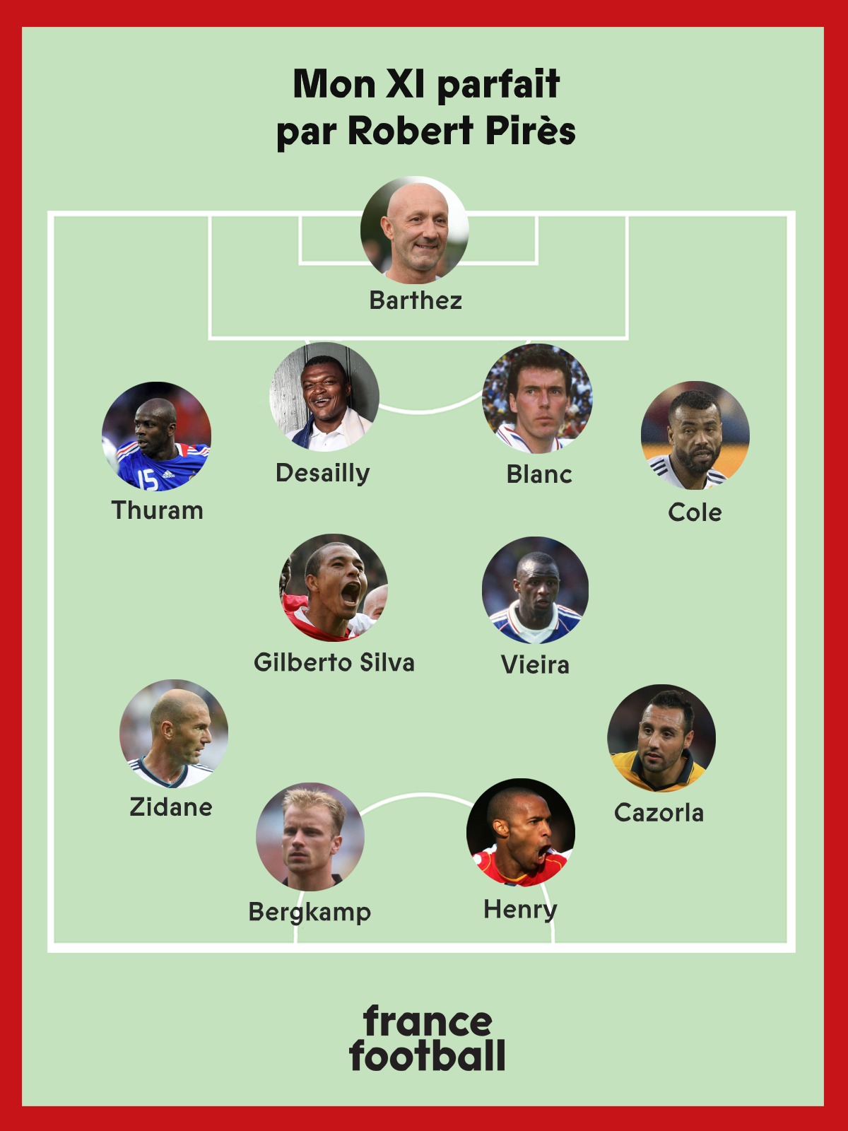 Команда Пиреса выглядит следующим образом: Бартез, Тюрам, Блан, Десайи, Коул, Жилберто Силва, Виейра, Зидан, Касорла, Анри, Бергкамп.