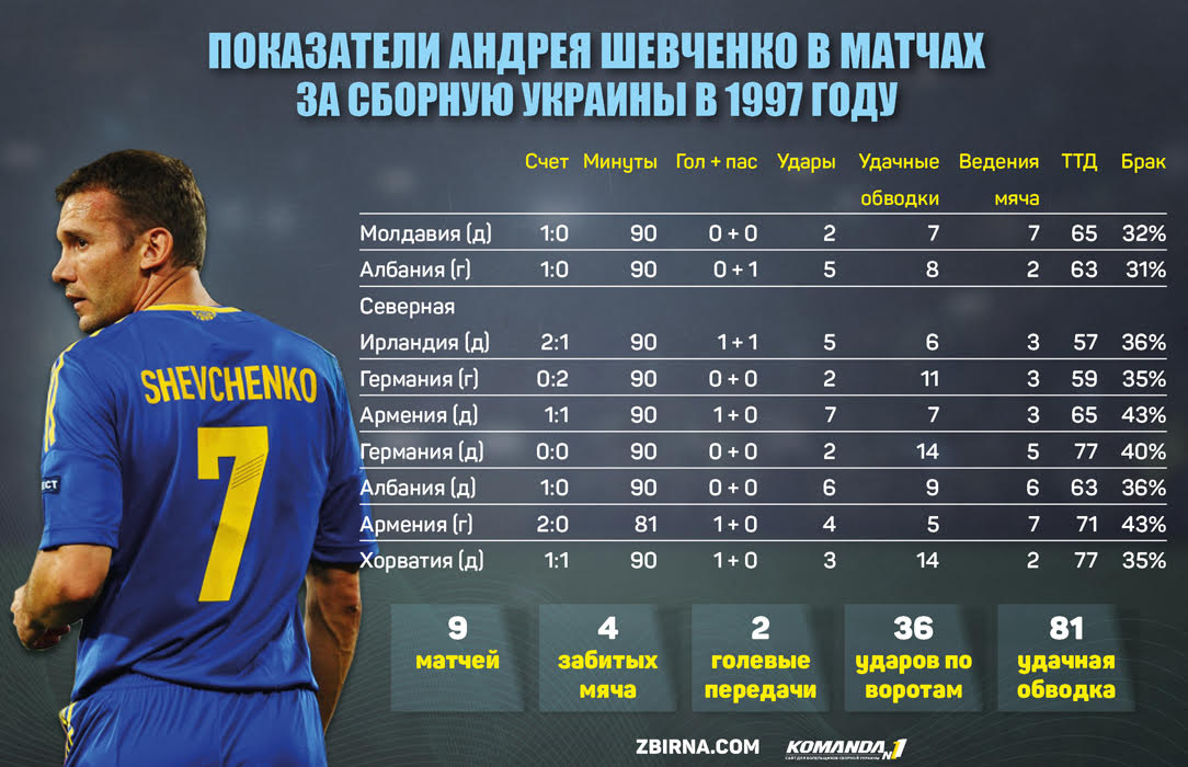В девяти матчах, сыгранных в 1997 году за сборную Украины, пишет zbirna.com, Андрей Шевченко совершил 81 обводку и нанес 36 ударов по воротам!