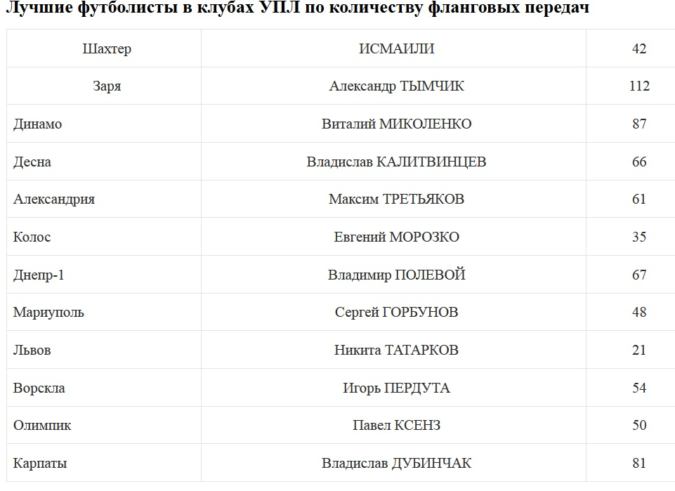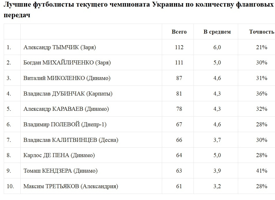 В пятерке лучших игроков УПЛ по количеству фланговых передач сразу четыре воспитанника киевского Динамо, пишет zbirna.com.