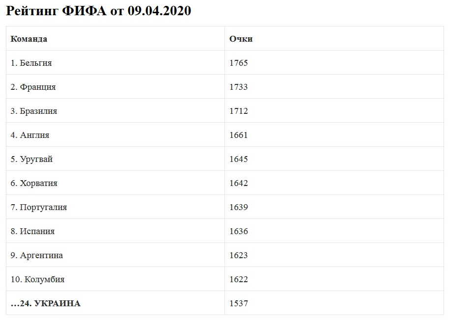 По состоянию реестра на 9 апреля сборная Украины занимает 24 место в мире и 15-е в Европе.