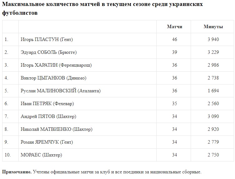 На данный момент лидером по количеству сыгранных матчей в сезоне среди всех украинских футболистов является защитник бельгийского Гента Игорь Пластун, пишет zbirna.com. В его активе 43 поединка за клуб во всех турнирах и три — за сборную Украины. В сумме получается 46. На втором месте — еще один бельгийский легионер, защитник Брюгге Эдуард Соболь (39). По 36 игр провели сразу несколько исполнителей, но, если учитывать минуты, то на третьем месте в рейтинге самых играющих украинцев — полузащитник Ференцвароша Игорь Харатин. Лучший результат среди украинцев из отечественного чемпионата — у хавбека Динамо Виктора Цыганкова.