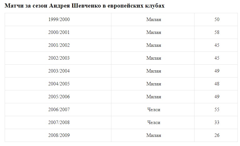 Несложно заметить, что с каждым годом количество матчей за сезон растет. Тут, конечно, многое зависит от того, выступает ли твой клуб в еврокубках (и как выступает) и играешь ли ты за сборную (желательно в финальных турнирах крупных форумов). На примере карьеры Андрея Шевченко в европейских клубах в этом можно легко убедиться.