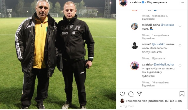 У коментарях фоловери, зокрема, запитали Віктора про те, чи планується його інтерв'ю із Ярославом Ракицьким, на що Вацко відповів категорично: "Не буде". І додав: "Інтерв'ю було записано, він відмовив у публікації".