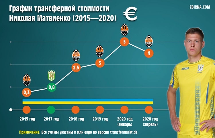 График трансферной стоимости Николая Матвиенко: плюс почти 4 млн евро за пять лет