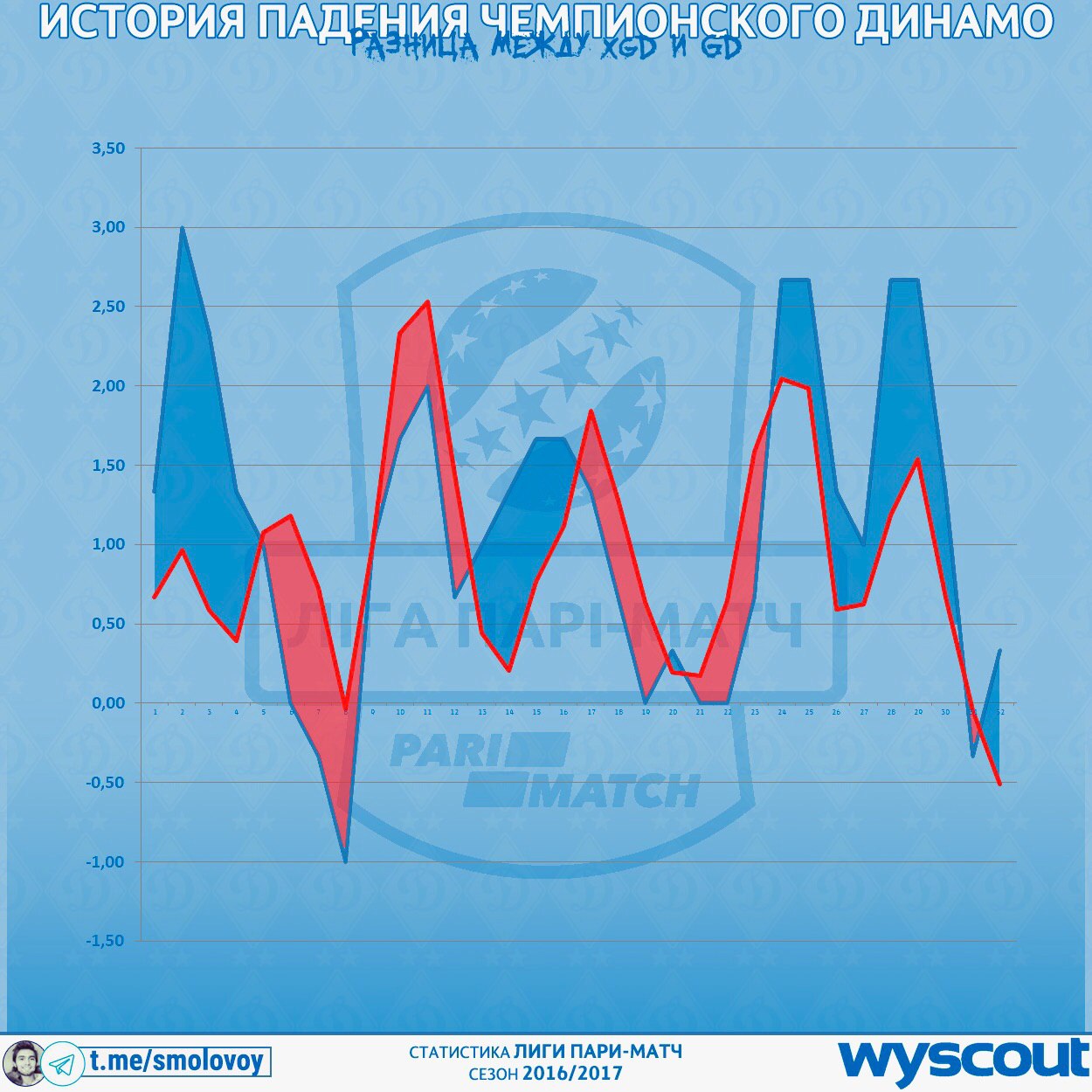 Не сказать, что Динамо по ожиданию (красная линия) творило чудеса, но 5 туров залетало исправно даже не вписывающееся в общую картину (синяя).