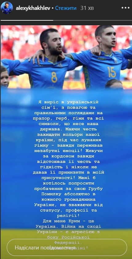 Живучи за кордоном, завжди відстоював її честь та гідність і ніколи не давав її принижувати в моїй присутності! Мені б хотілося попросити пробачення за свою грубу помилку абсолютно у кожного громадянина України, незалежно від статусу, професії та релігії! Для мене Крим – це Україна. Війна на Сході України – агресія з боку Російської Федерації", – написав Хахльов в Instagram.