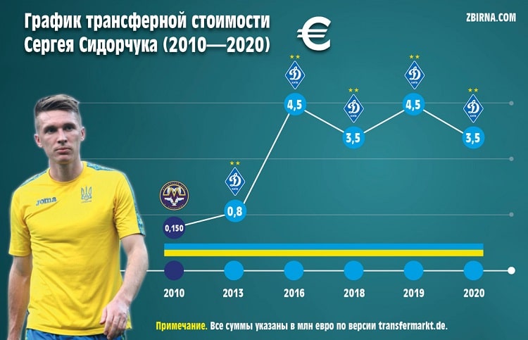 Сегодня разберем график трансферной стоимости капитана киевского Динамо и полузащитника сборной Украины Сергея Сидорчука. К слову, прямо сейчас опытнейший хавбек занимает двадцатое место в списке самых дорогих футболистов отечественной Премьер-лиги.