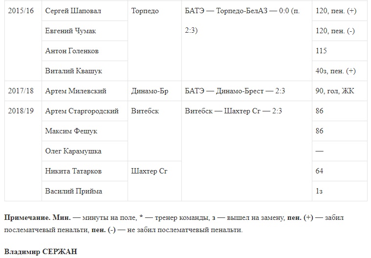 Забивали в финалах Денис Федоров, Старгородский и Милевский. Во всех случаях из команды побеждали, а Старгородский в 2014-м и вовсе оформил решающий гол. Послематчевые пенальти били пять футболистов, и лишь Евгений Чумак промахнулся. Еще шесть игроков получали желтые карточки.