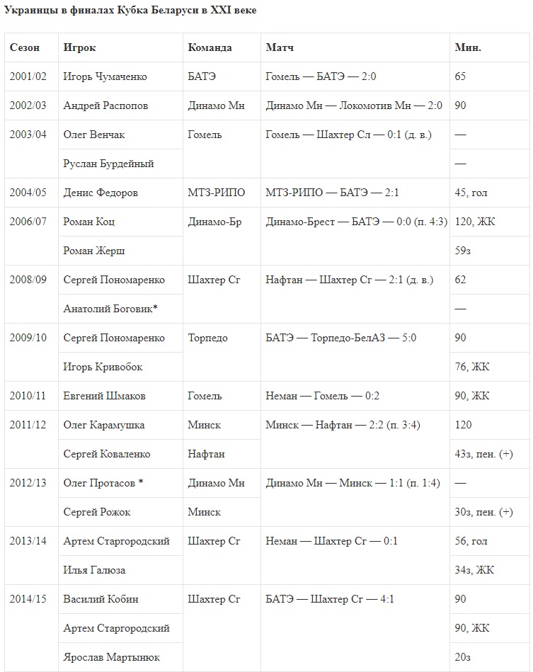 В решающих схватках побеждали команды 16-ти наших игроков. В четырех случаях одновременно добывали титул сразу несколько украинцев. Например, в сезоне-2015/16 Кубок Беларуси завоевали четверо отечественных футболистов, выступавших за Торпедо-БелАЗ. Последними, кто брал трофей, в прошлом году стали солигорцы Никита Татарков и Василий Прийма.
