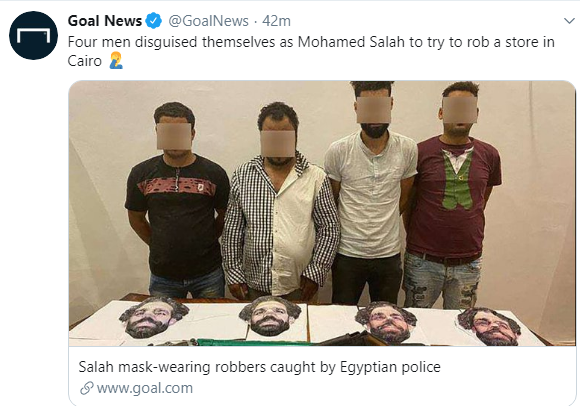 В Каире полиция задержала банду грабителей, использовавших маски нападающего «Ливерпуля» Мохаммеда Салаха для сокрытия личности. Об этом сообщает Goal.
