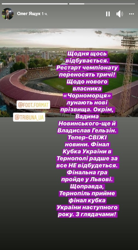 - Финал Кубка Украины в Тернополе, скорее всего, не состоится. Финальная игра пройдет во Львове. Правда, Тернополь примет финал Кубка Украины в следующем году. Со зрителями! – написал Ящук.