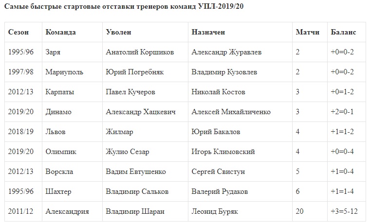 После трех начальных туров уходили в отставку шесть тренеров в истории УПЛ. Однако четыре наставника умудрились уйти уже после двух — Анатолий Коршиков (Заря), Юрий Погребняк (Ильичевец), Владимир Атаманюк и Игорь Лучкевич (оба — Металлург З). Во всех случаях оба стартовых поединка их команды проиграли.