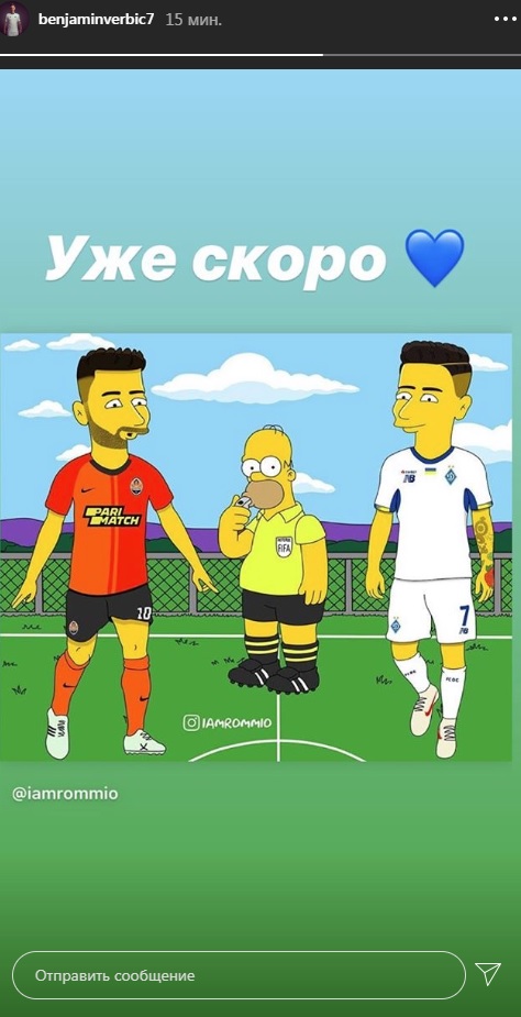 Полузащитник "Динамо" Беньямин Вербич анонсировал сегодняшний матч с донецким "Шахтером" с помощью картинки, на которой он и нападающий горняков Жуниор Мораес изображены в виде персонажей из популярного мультсериала "Спимпсоны".