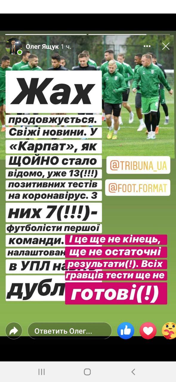 Журналист «Футбольного формата» Олег Ящук в своем Instagram сообщил о 13-ти случаях заражения среди футболистов "Карпат", семь из которых являются игроками первой команды.