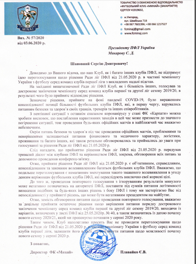 Однако, как стало известно UA-Футбол, не всем нравится даже идея самого переголосования. В распоряжении редакции оказался образец письма, направленного клубом "Минай" в дирекцию ПФЛ, в котором клуб из Закарпатья просит не проводить переголосование, утвердить результаты сезона и определить дату начала следующего сезона. Приводим читателям копию документа.