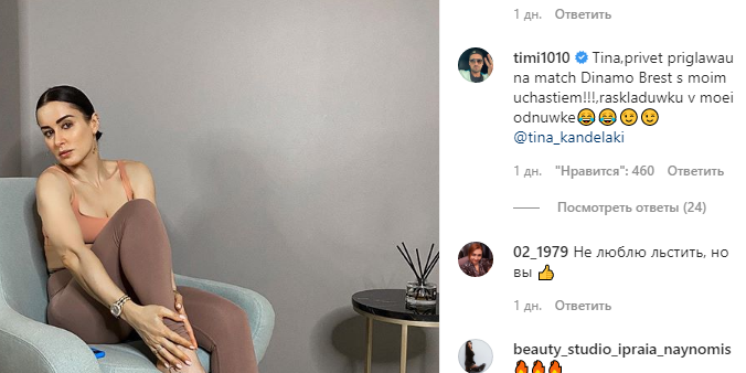 Следующей, кому "посчастливилось", стала Тина Канделаки. Сообщение Артема было таким: "Тина, приглашаю тебя на матч "Динамо" Брест с моим участием. Раскладушку в моей однушке я подготовлю".