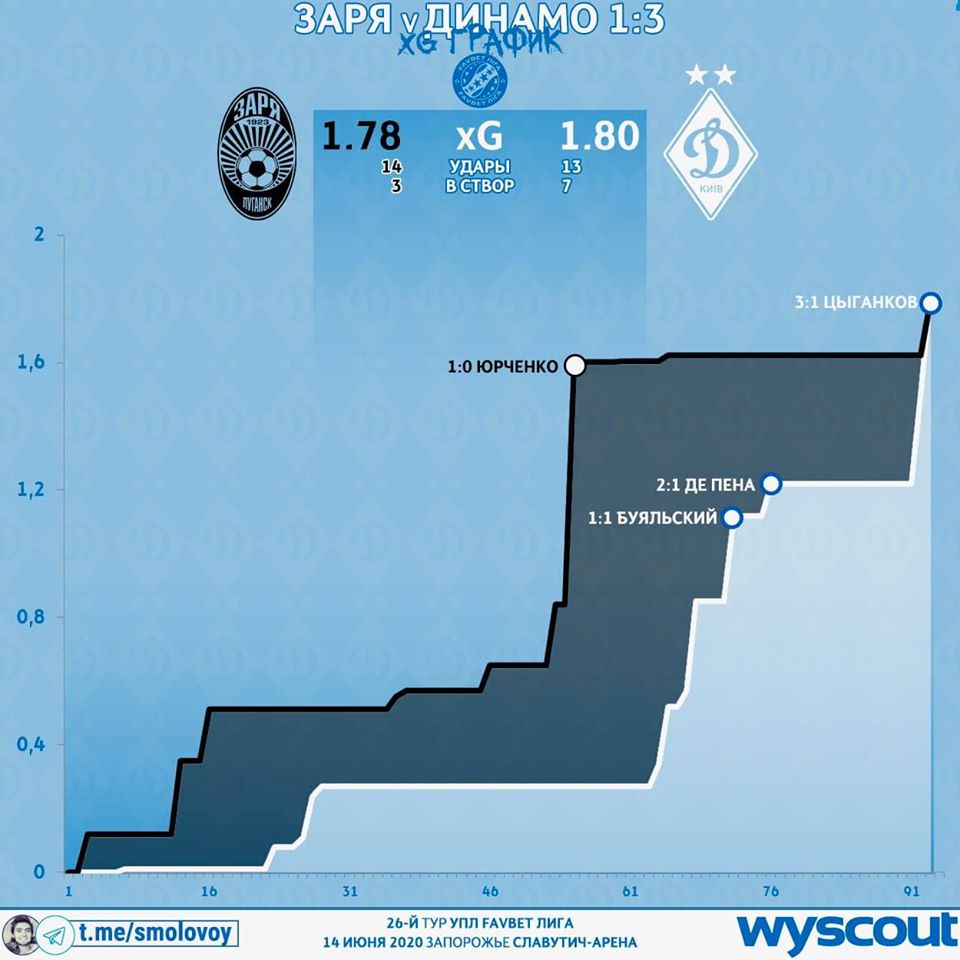 Динамо начало играть после 60’ минуты (см. график), когда Заря уже закончилась и ни на что на поле не влияла... - написал Смоловой в Фейсбуке.