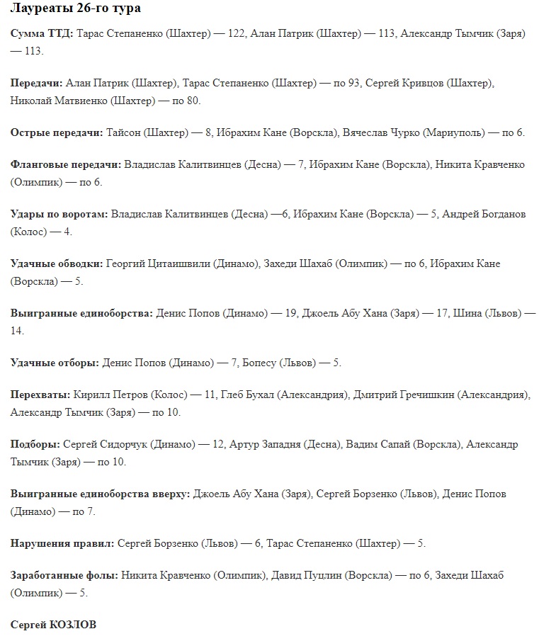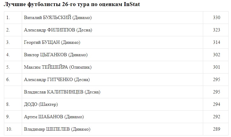 Лучшим игроком предыдущего тура по оценкам компании InStat стал защитник Динамо Томаш Кендзера, пишет zbirna.com. Спустя неделю эстафету у него принял хавбек сборной Украины — Виталий Буяльский. В поединке с Зарей именно он забил переломный гол, который помог киевлянам одержать волевую победу. На хорошем уровне отыграл в этом туре и нападающий Десны Александр Филиппов. В десятку самых полезных игроков уик-энда вошли сразу три представителя черниговского клуба, но динамовцев там оказалось больше — пятеро.