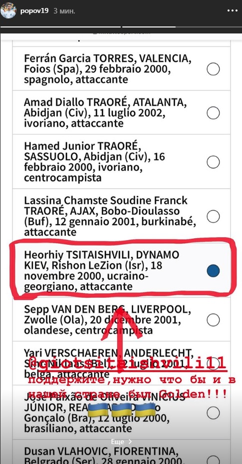 Защитник "Динамо" Денис Попов призвал всех поддержать полузащитника команды Георгия Цитаишвили, который претендует на премию Golden Boy 2020.