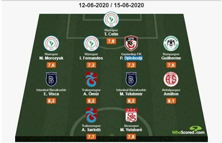 Здесь оказались сразу трое игроков "Ризеспора" - вратарь Тарик Четин (7.60 балла), центрбэк Иванильдо Фернандес (7.26 балла) и наш Николай Морозюк (7.59 балла).