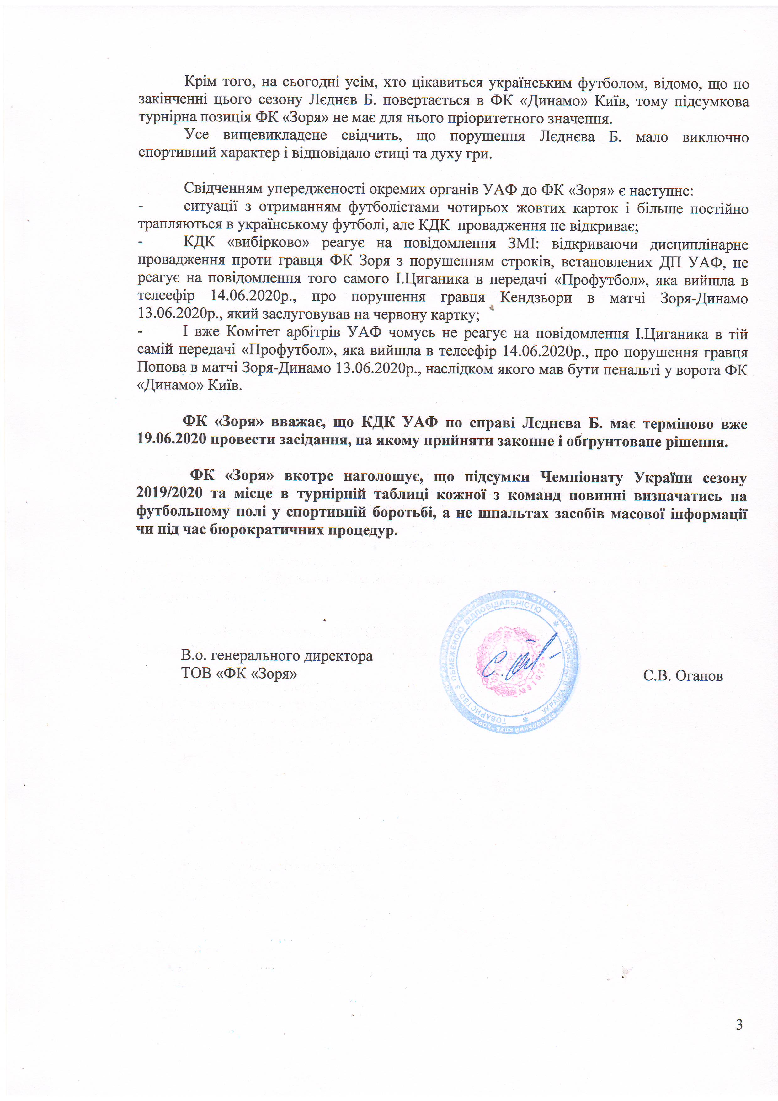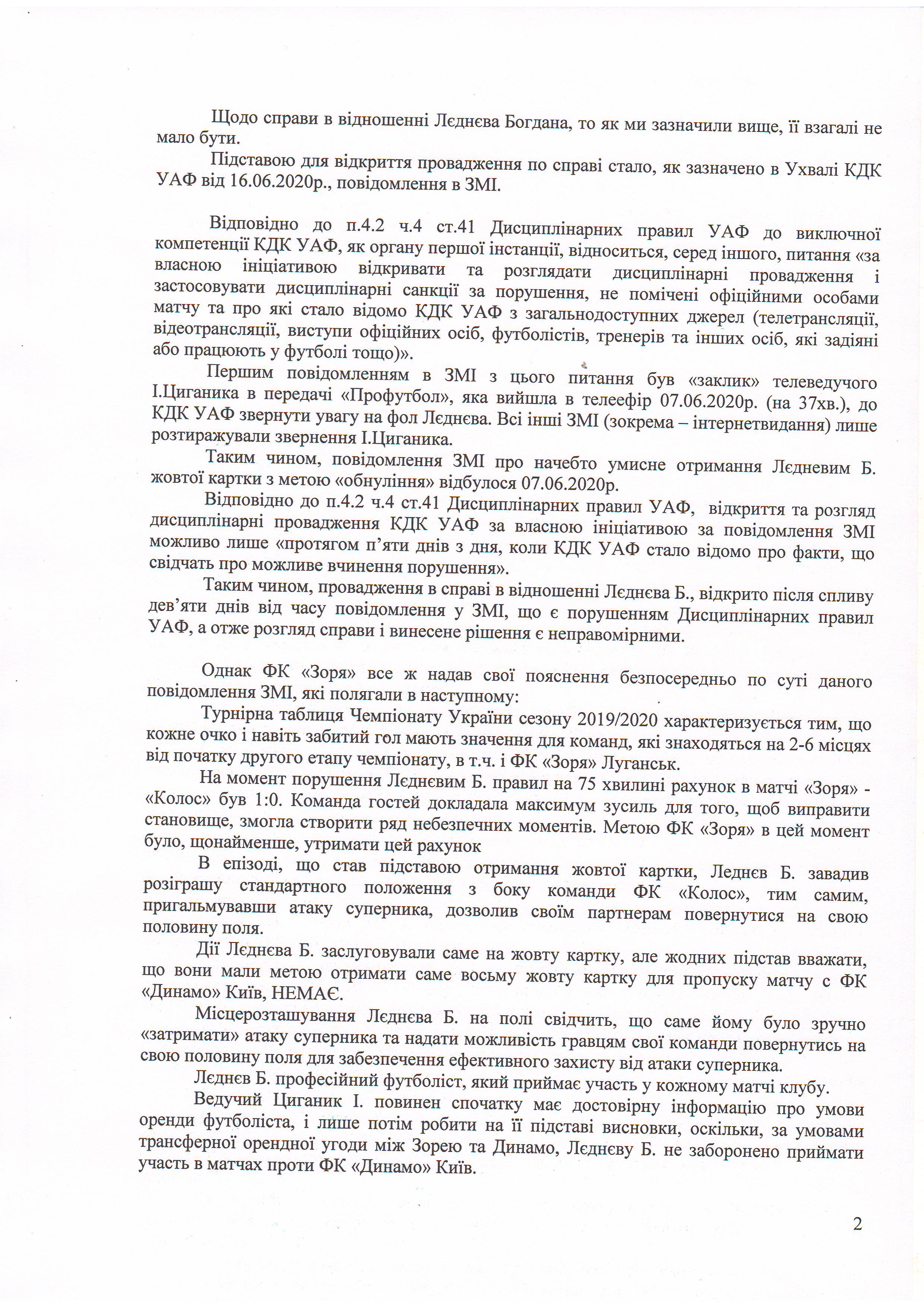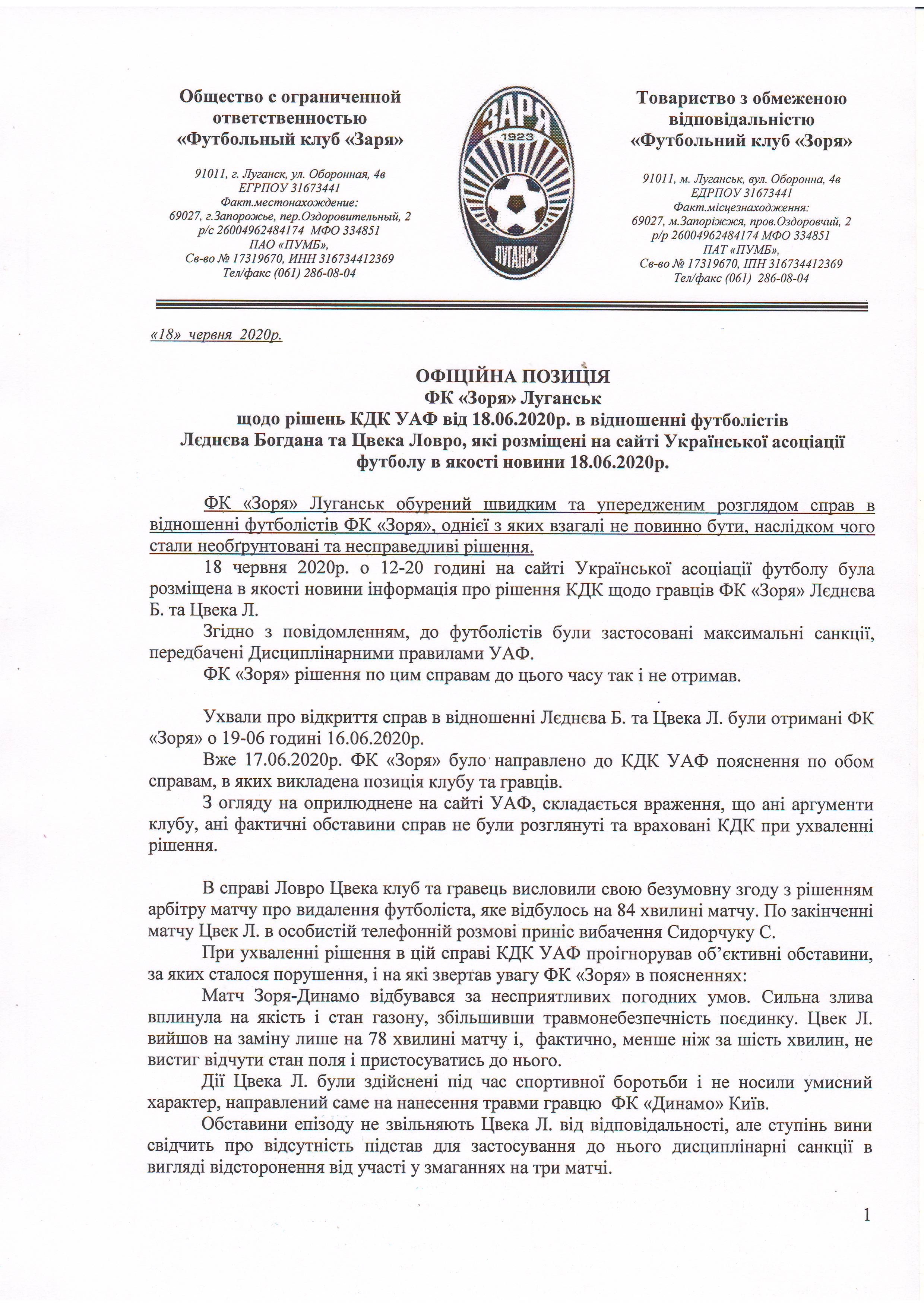По итогам заседания контрольно-дисциплинарного комитета вынесены решения относительно дисквалификации полузащитника «Зари» Богдана Леднева ещё на один матч, а полузащитника Ловро Цвека – на три игры. Футбольный клуб «Заря» категорически не разделяет данные решения.