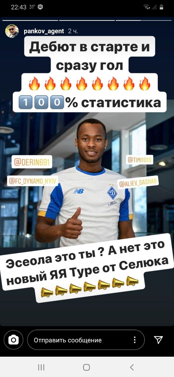 "Дебют в основе, и сразу гол. 100% статистика. Эсеола – это ты? Нет, это новый Яя Туре от Селюка", - написал Панков.