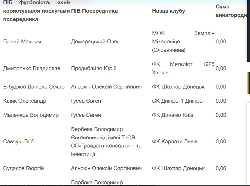 У відповідності до наданої інформації посередниками, клубами та футболістами за період із 1 квітня 2019 року по 31 березня 2020 року послугами посередників, під час укладання трудових контрактів користувались тільки нижченаведені футболісти: