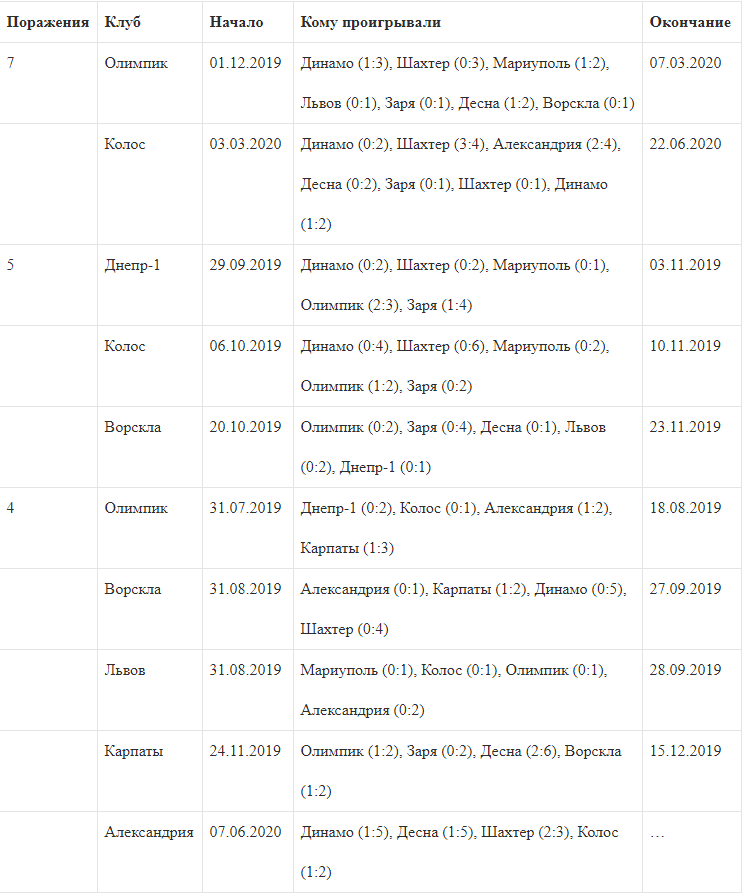 Топ-10 худших серий сезона-2019/2020 в чемпионате Украины по количеству поражений кряду
