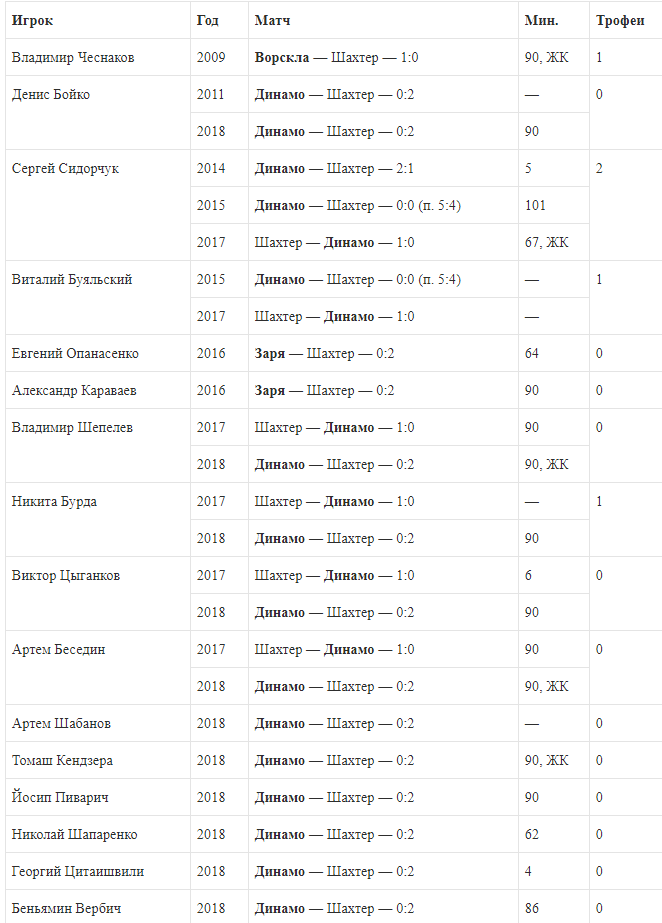 Три решающих схватки у Сидорчука, по две — у Буяльского, Бурды, Дениса Бойко, Владимира Шепелева, Виктора Цыганкова и Артема Беседина. У остальных исполнителей — по одному финалу. Отметим, что в 2018-м Георгий Бущан и Виталий Миколенко выступали в Кубке, но их не было даже на лавочке в матче с Шахтером.