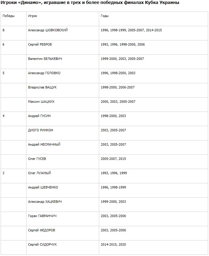 Финал Кубка Украины-2019/20 впервые стал победным для всех игроков «Динамо», принимавших участие в матче с «Ворсклой», за исключением Сергея Сидорчука, который отпраздновал уже третью викторию.
