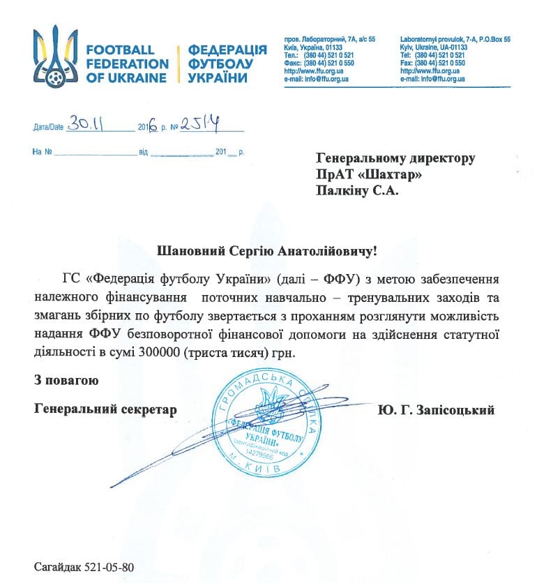 Журналист Константин Андриюк опубликовал письмо УАФ «Шахтеру» с просьбой безвозмездно выделить 300 тысяч гривен на финансирование тренировок и соревнований сборных в 2016 году.