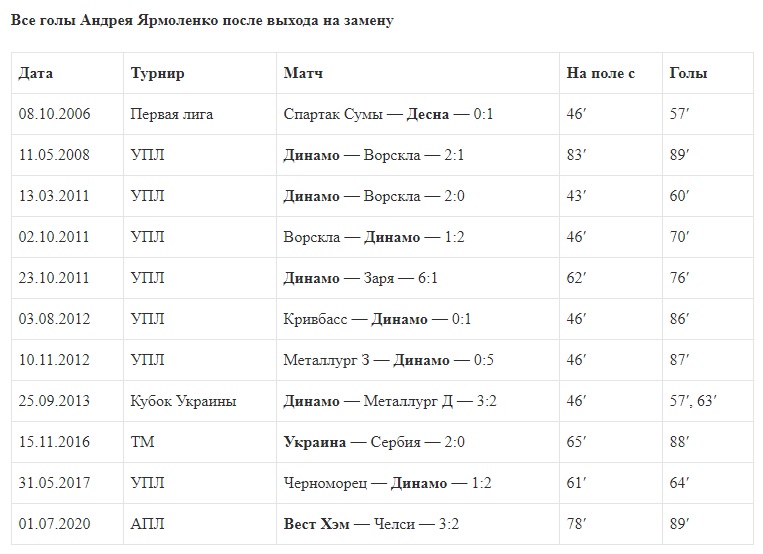 Украинец в этих матчах огорчал девятерых соперников. Примечательно, что трижды он расписывался в воротах Ворсклы. Единственный дубль после замены Ярмоленко оформил в кубковом поединке с донецким Металлургом в 2013-м. Во всех случаях команды Андрея в итоге побеждали.