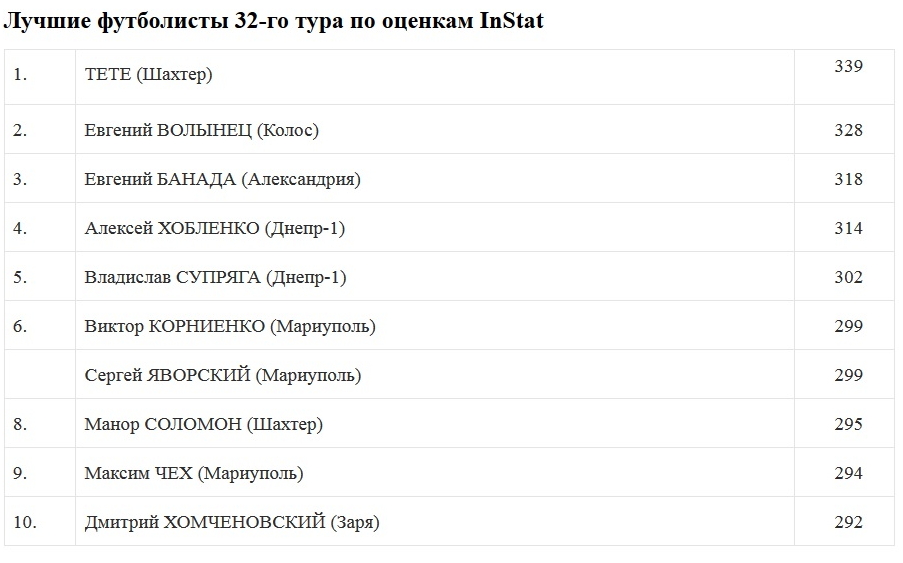 В молодежном варианте состава Шахтер в матче с Александрией выделялся бразильский полузащитник Тете. В его активе было три удара по воротам, две острые передачи, семь удачных обводок и один забитый мяч. Бразилец в итоге стал самым полезным игроком минувшего тура по оценкам InStat. Наибольшее представительство в Топ-10 — у Мариуполя (три футболиста). Снова хорошо проявили себя днепряне, но мы должны помнить, в какой шестерке выступают те или иные коллективы. И против каких составов они порой сражаются…
