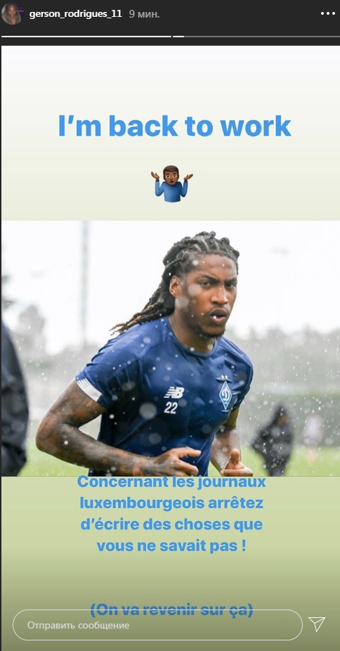 Форвард "Динамо" Жерсон Родригес приступил к тренировкам с командой после возвращения из аренды в "Анкарагюджю". Футболист поспешил поделиться этой радостной новостью в Инстаграме, а также упрекнул люксембургские СМИ в распространении неверной информации о нем.