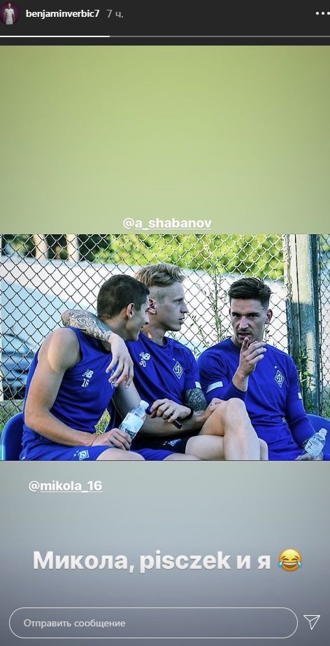 Травмированный полузащитник "Динамо" Беньямин Вербич показал фото с тренировки команды, на котором он запечатлен в компании своих одноклубников Виталия Миколенко и Артема Шабанова.