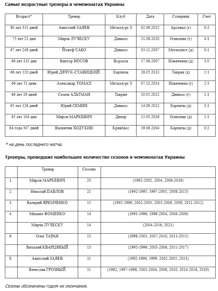 Свой первый матч в чемпионатах Украины на посту главного тренера «Динамо» Мирча Луческу провел в 75 лет 23 дня. В более «преклонном» возрасте работал в УПЛ только Анатолий Заяев. Между тем Луческу открыл свой уже 14-й сезон в премьер-лиге. Больший стаж выступления в украинских чемпионатах имеют лишь Мирон Маркевич, Николай Павлов и Валерий Яремченко.