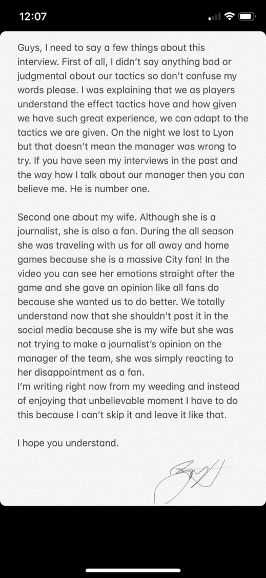 Второе, насчет моей жены. Она – и журналист, и болельщик. Во время сезона она ездила с нами на все гостевые и домашние матчи, потому что она – большой фан «Ман Сити». На том видео вы увидели ее эмоции прямо после матча. Она выразила свое мнение, как это делают и другие фанаты. Но она хотела только сделать нас лучше. Мы понимаем, что она не должна была постить это в социальных сетях, потому что она – моя жена. Но она не пыталась высказать журналистское мнение о тренере, она просто выразила разочарование как болельщица.