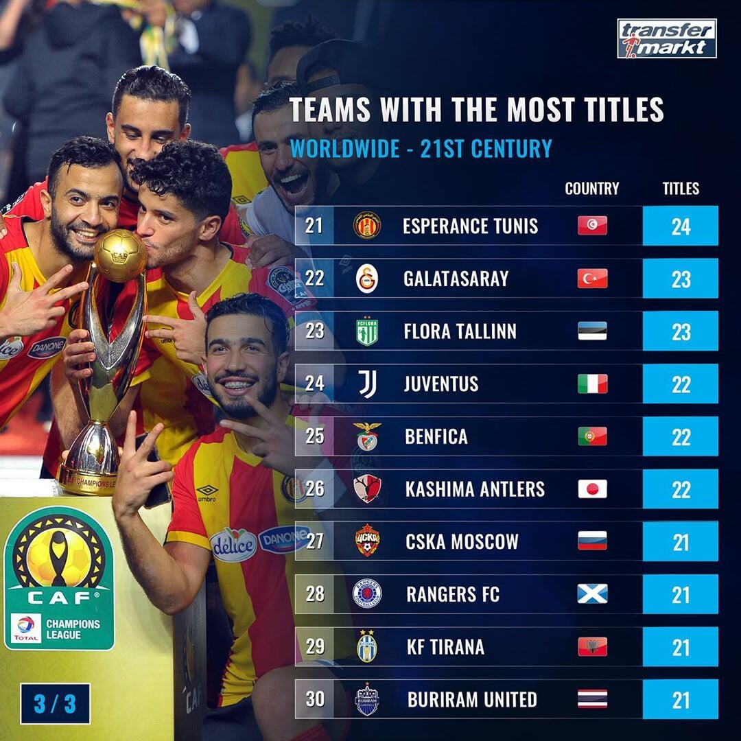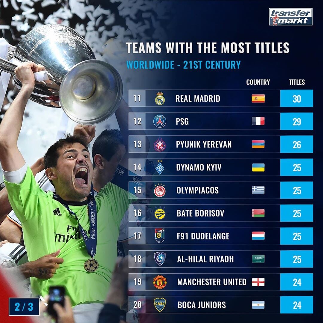 Transfermarkt опубликовал список лучших 30 клубов мира по количеству трофеев в XXI веке.