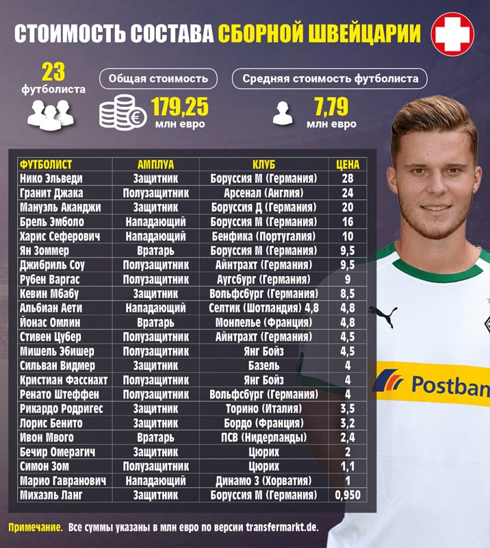 Состав первого соперника Украины в Лиге наций, сборной Швейцарии, стоит почти 180 млн евро