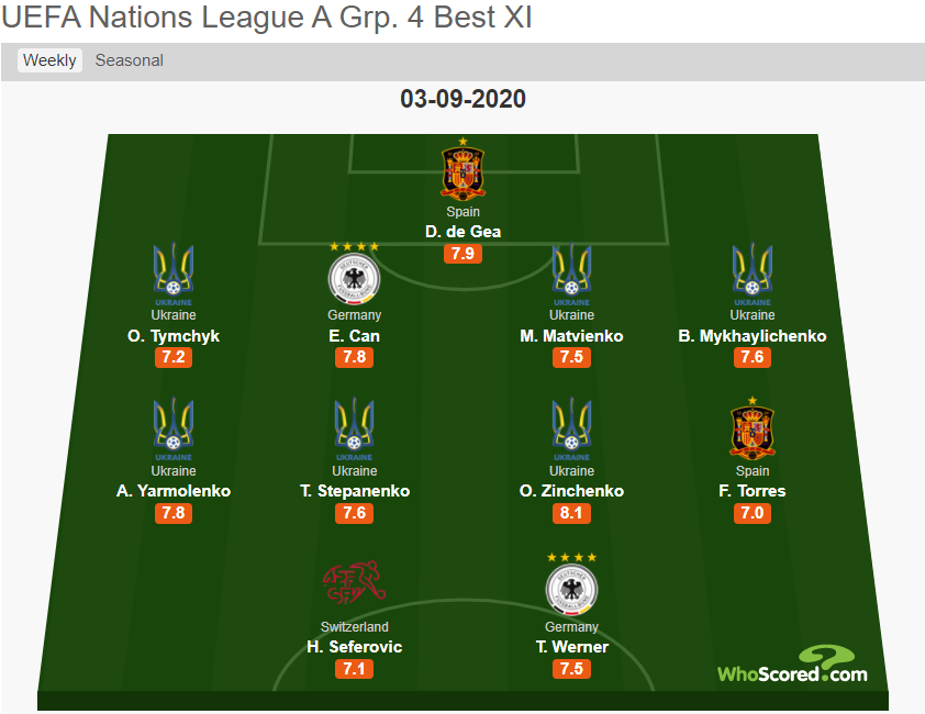 6 из 11 футболистов составленной команды представляют украинскую сборную: Александр Тымчик, Николай Матвиенко, Богдан Михайличенко, Андрей Ярмоленко, Тарас Степаненко и Александр Зинченко.