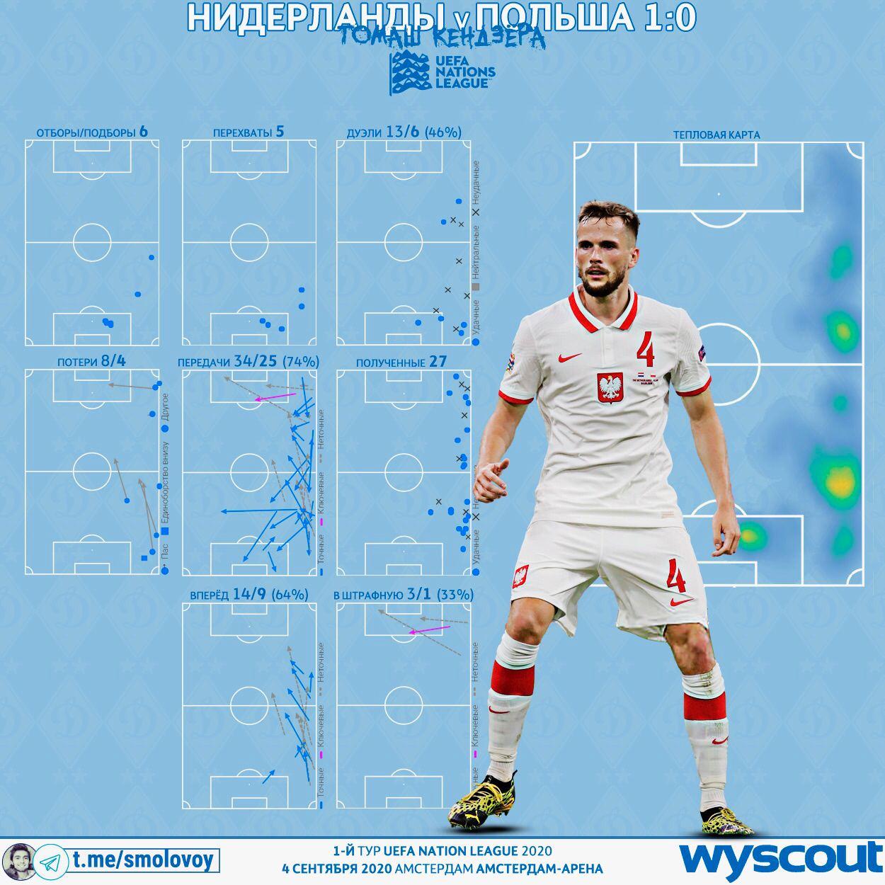 Блогер Михаил Смоловой в своем Telegram-канале анализирует игру защитника "Динамо" Томаша Кендзеру за сборную Польши в матче с Голландией.