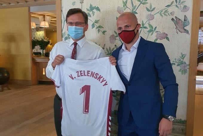 Министр иностранных дел Украины Дмитрий Кулеба во время визита в Испанию встретился с форвардом «Альбасете» Романой Зозулей, который передал именные футболки.