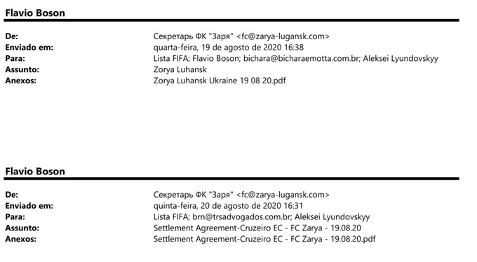 Пока «Крузейро» пытается найти правду в ФИФА, а руководитель их юридического департамента Флавио Бозон озадачен получением ответов на свой вопрос, который обозначил через бразильскую прессу: «Надеюсь, «Заря» мне расскажет, что случилось с их электронной почтой. Получается, что кто-то чужой вошел в нее и отправлял нам письма?»