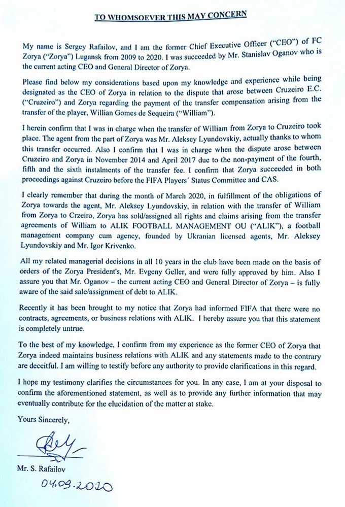 На аргументы «Зари» о том, что клуб не сотрудничает с Alik Football Management, «Крузейро», прибегнув к помощи «тяжелой артиллерии», приложил пояснения, взятые в письменном виде у бывшего генерального директора луганчан Сергея Рафаилова. В них один из экс-руководителей «Зари» сообщает, что утверждение об отсутствии контрактов, соглашений или коммерческих отношений между луганчанами и Alik Football Management не соответствует действительности. Указанной эстонской компанией, по данным Рафаилова, управляют граждане Украины, а переуступка долга по Виллиану Гомесу со стороны луганского клуба произошла еще в марте нынешнего года с одобрения президента «Зари» Евгения Геллера