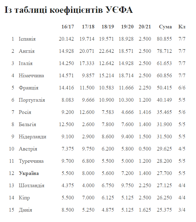 Отже, в активі України наразі 7 очок або 1,4 бала. Наша асоціація посідає 12-те місце, відставання від Австрії складає 1,925 бала (10 очок), від Туреччини — 0,5 (2,5). Саме із цими країнами ми боротимемося за 10-ту позицію, яка дозволяє заявити свого представника до групового раунду Ліги чемпіонів напряму (11-те місце зможе це зробити лише за певних обставин).