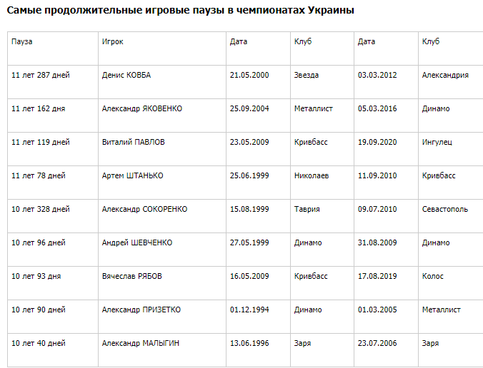 Более продолжительные игровые паузы, чем у Павлова (11 лет 119 дней), имели только Денис Ковба и Александр Яковенко.