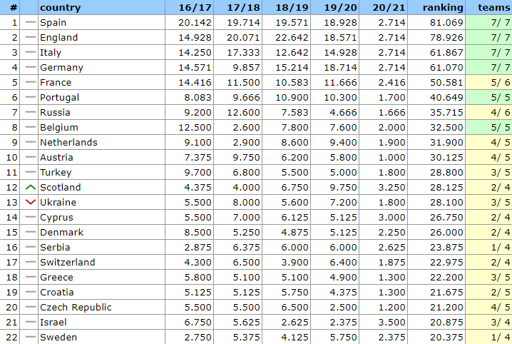 Печальная картина нарисовалась, а с 2016 года ее начали рисовать! Упали результаты команд в еврокубках, этого стоило ожидать, ведь уровень УПЛ тоже рухнул в пропасть. Подтянуть рейтинг могут два клуба это ДК и ШД, но нужно каждый год выходить клубам в евровесну, в ЛЕ не ниже 1/4. Это сложная задача, мне кажется лучше опуститься ещё ниже и спокойно играть в еврокубках 4мя командами.