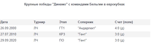 - 3-я крупная победа "Динамо" во всех еврокубках именно с представителями Бельгии. Интересно, что их разделяет почти 10 лет и все разгромные виктории зафиксированы на своем поле в Лиге чемпионов (ЛЧ).