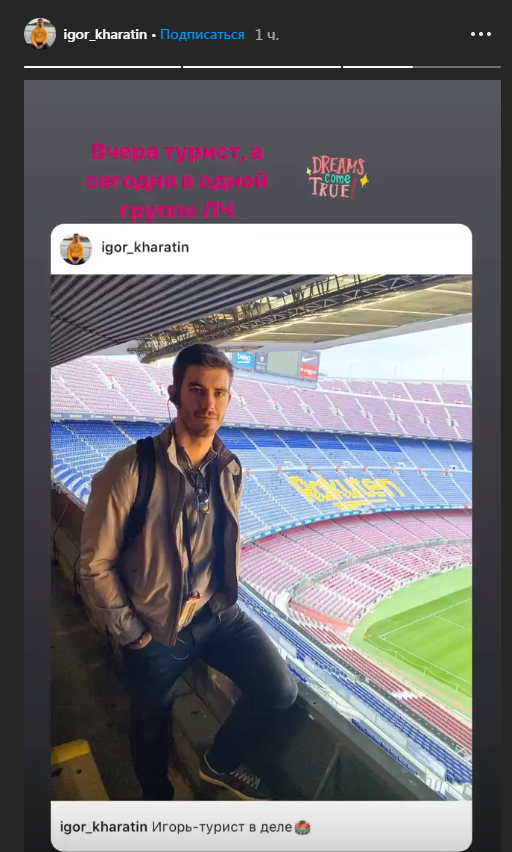 "Вчера турист, а сегодня в одной группе ЛЧ", - написал украинец в своем Инстаграме на фото с "Камп Ноу".