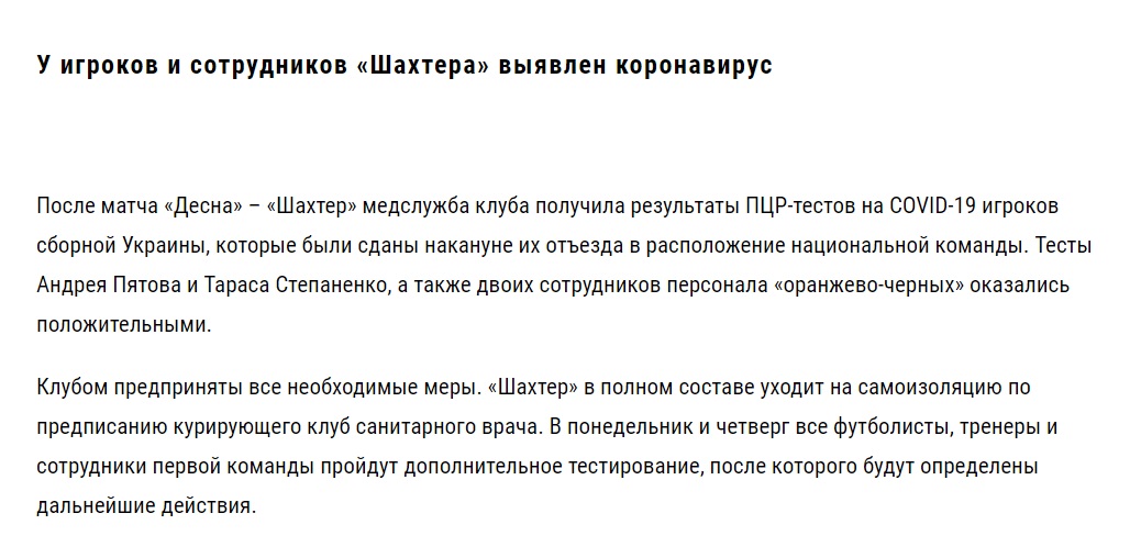 В общем, вопросов и несуразностей очень-очень много, тем интереснее будет, как разрешится эта ситуация. Пока всё это очень похоже на красивый финт ушами от «Шахтера», и предположу, что в четверг «Шахтер» всё-таки направит в сборную для участия уже в официальных матчах ряд игроков, у которых коронавирус не будет подтвержден.